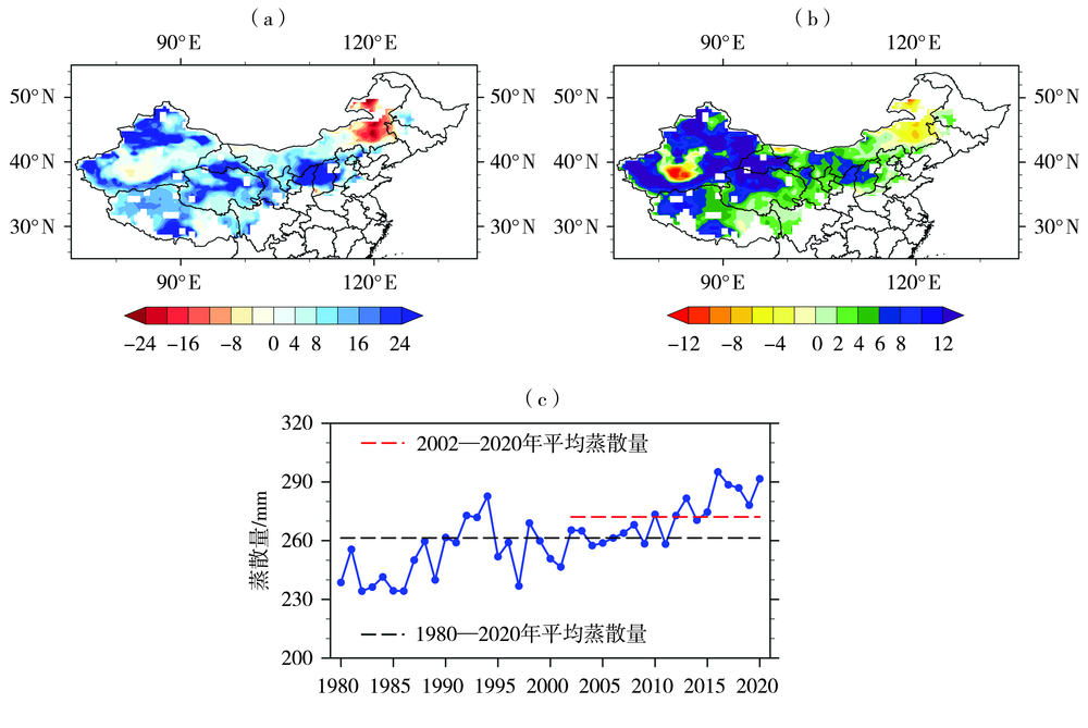 图7 中国北方旱区2002—2020年与1980—2020年平均年蒸散量差值(a,单位:mm)、差值占1980—2020平均年蒸散量的百分比(b)的空间分布和1980—2020年平均蒸散量年际变化(c)