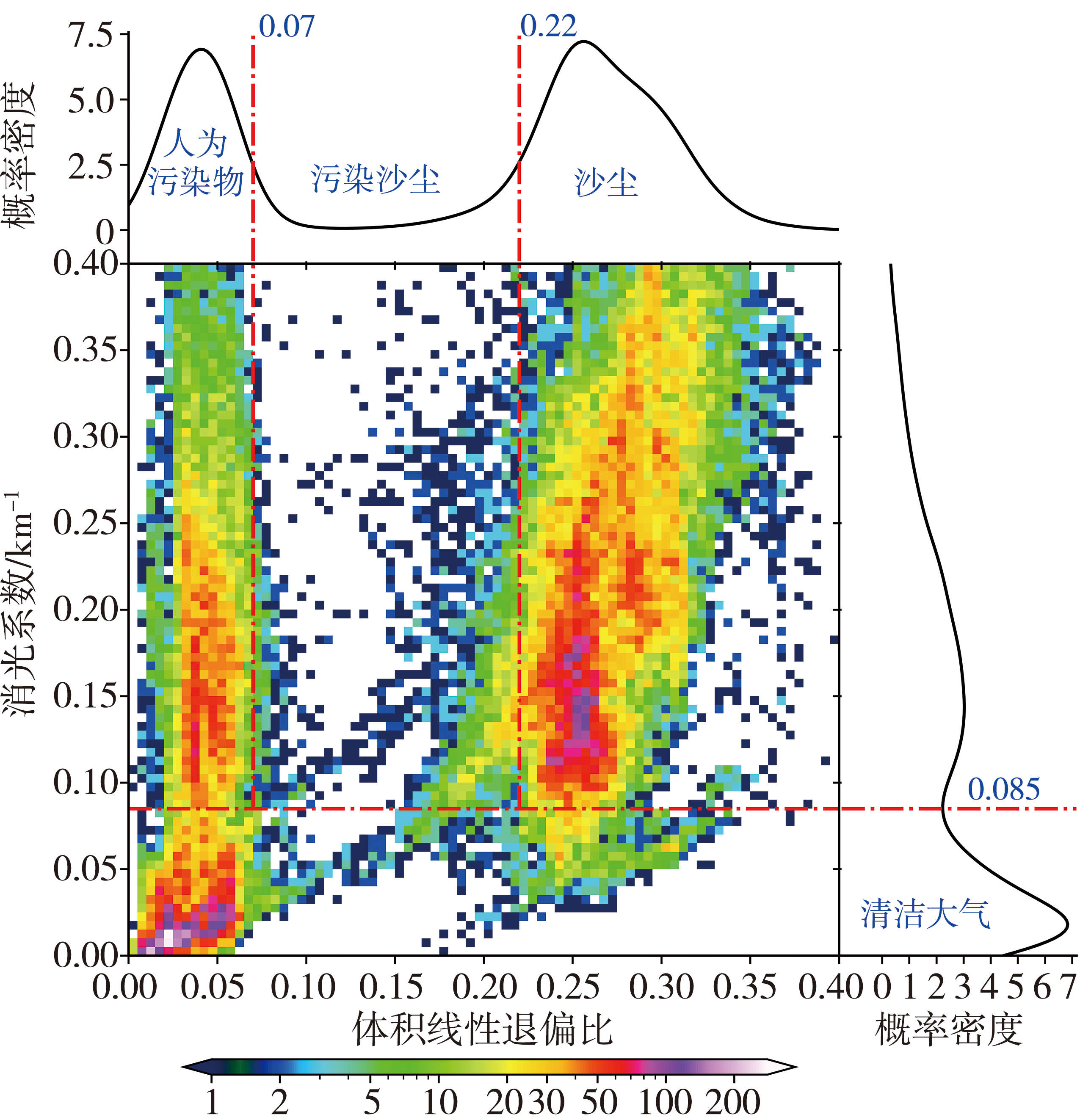气溶胶类型的准确识别是进一步研究其气候与环境效应的重要前提。基于兰州大学半干旱气候与环境观测站2009年10月至2012年11月地基双波长偏振激光雷达观测资料,分别在清洁天、人为污染物、沙尘事件和强沙尘暴事件4种典型情形下挑选若干个例,对其气溶胶消光系数、体积线性退偏比、气溶胶退偏比等进行统计分析,明确不同气溶胶类型的判定阈值。结果表明:清洁天该区域气溶胶消光系数小于0.085 km-1。在消光系数大于该阈值的污染情形下,人为污染物的体积线性退偏比小于0.07,相应的气溶胶退偏比小于0.09;污染沙尘的体积线性退偏比介于0.07和0.22之间,气溶胶退偏比为0.09~0.31;纯沙尘的体积线性退偏比大于0.22,气溶胶退偏比大于0.31。当出现强沙尘暴时,体积线性退偏比大于0.35,气溶胶退偏比大于0.49。