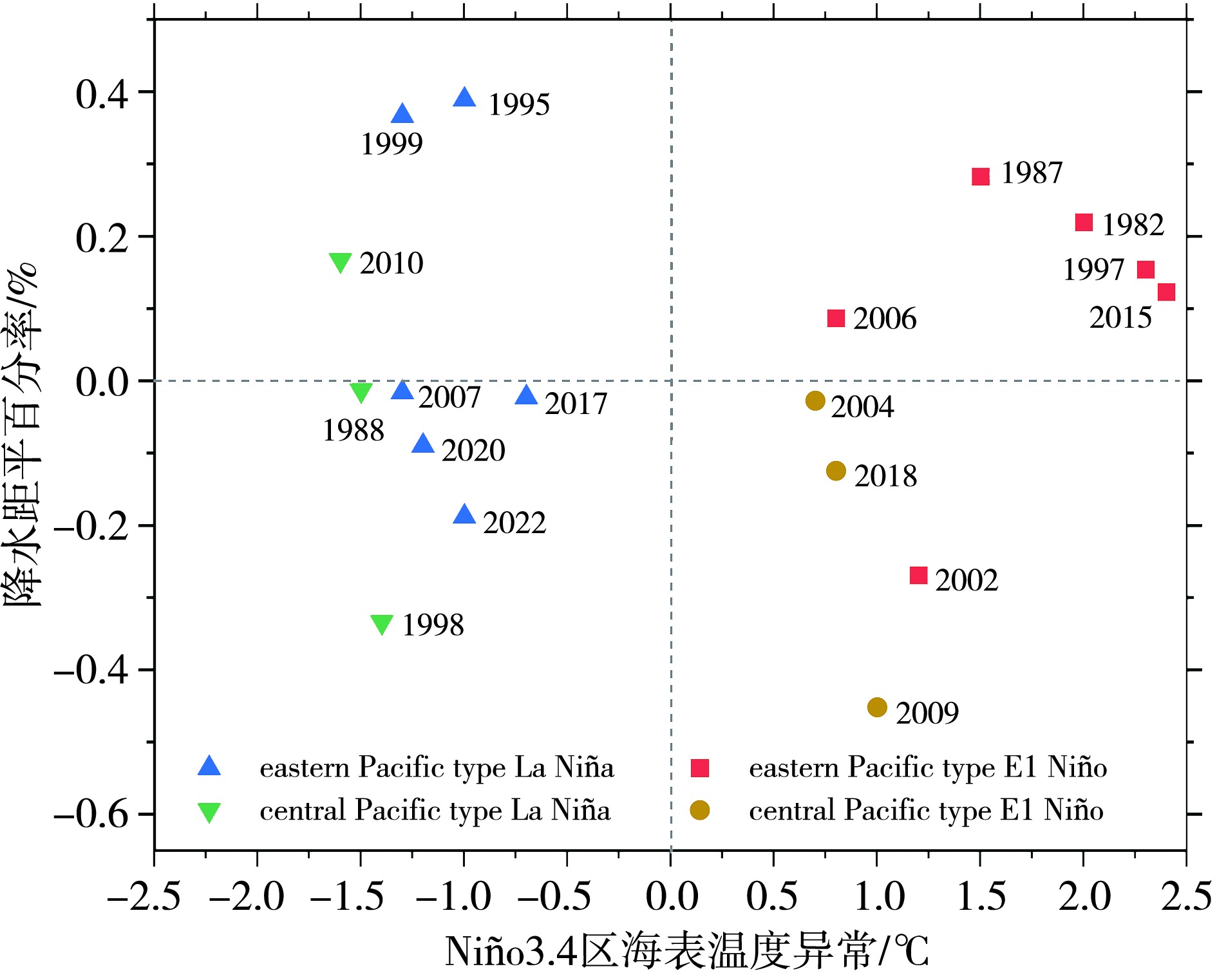 Fig.3 Scatterplot of autumn average precipitation anomaly percentage in Yunnan and the SSTA in Niño3.4 area in eastern Pacific and central Pacific type El Niño/La Niña years