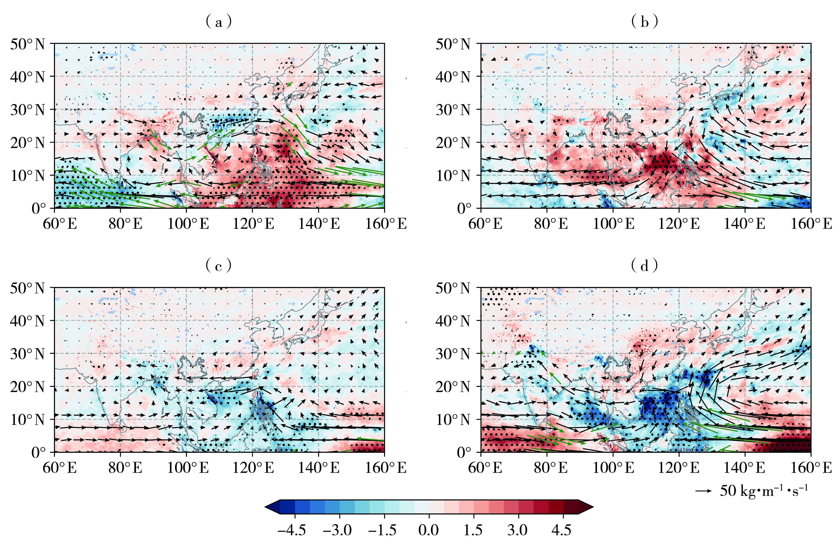 Fig.6 Composite distributions of water vapor flux anomalies (arrow vectors, Unit: kg·m-1·s-1) and water vapor flux divergence anomalies (shaded areas, Unit: 10-5 kg·m-2·s-1) in eastern Pacific type El Niño (a) and La Niña (c) years, central Pacific type El Niño (b) and La Niña (d) years (The green arrows pass the significance test at the 90% confidence level for water vapor flux anomalies, dotted areas passes the significance test at the 90% confidence level for water vapor flux divergence anomalies)
