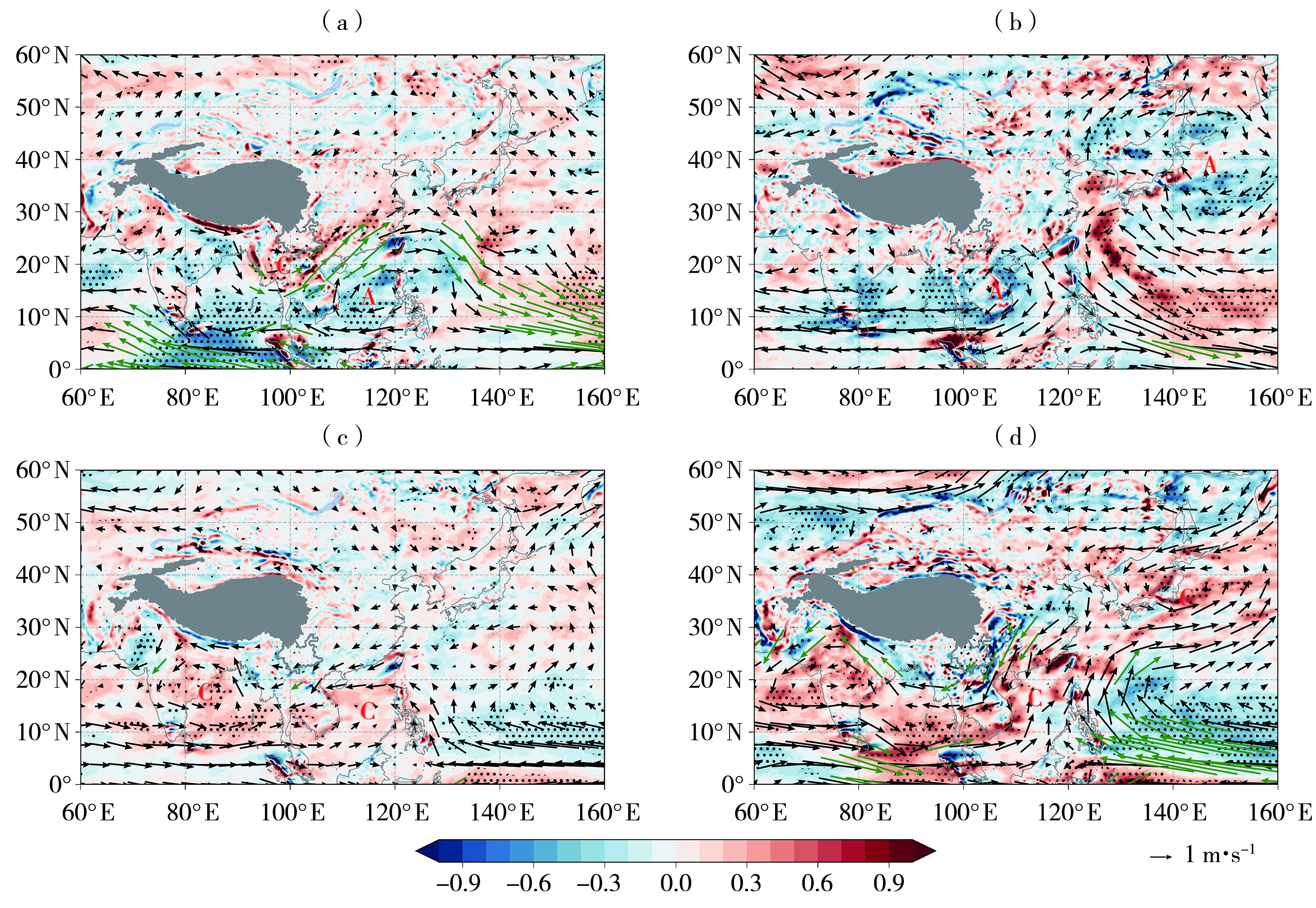 Fig.8 Composite distributions of wind anomalies (arrow vectors, Unit: m·s-1) and vorticity anomalies (shaded areas, Unit: 10-5s-1) at 850 hPa in eastern Pacific type El Niño (a) and La Niña (c) years, central Pacific type El Niño (b) and La Niña (d) years (The green arrows pass the significance test at the 90% confidence level for wind anomalies, dotted areas passes the significance test at the 90% confidence level for vorticity anomalies; letters C and A denote cyclonic and anticyclonic circulation anomalies, respectively; gray shaded areas are plateau terrain)