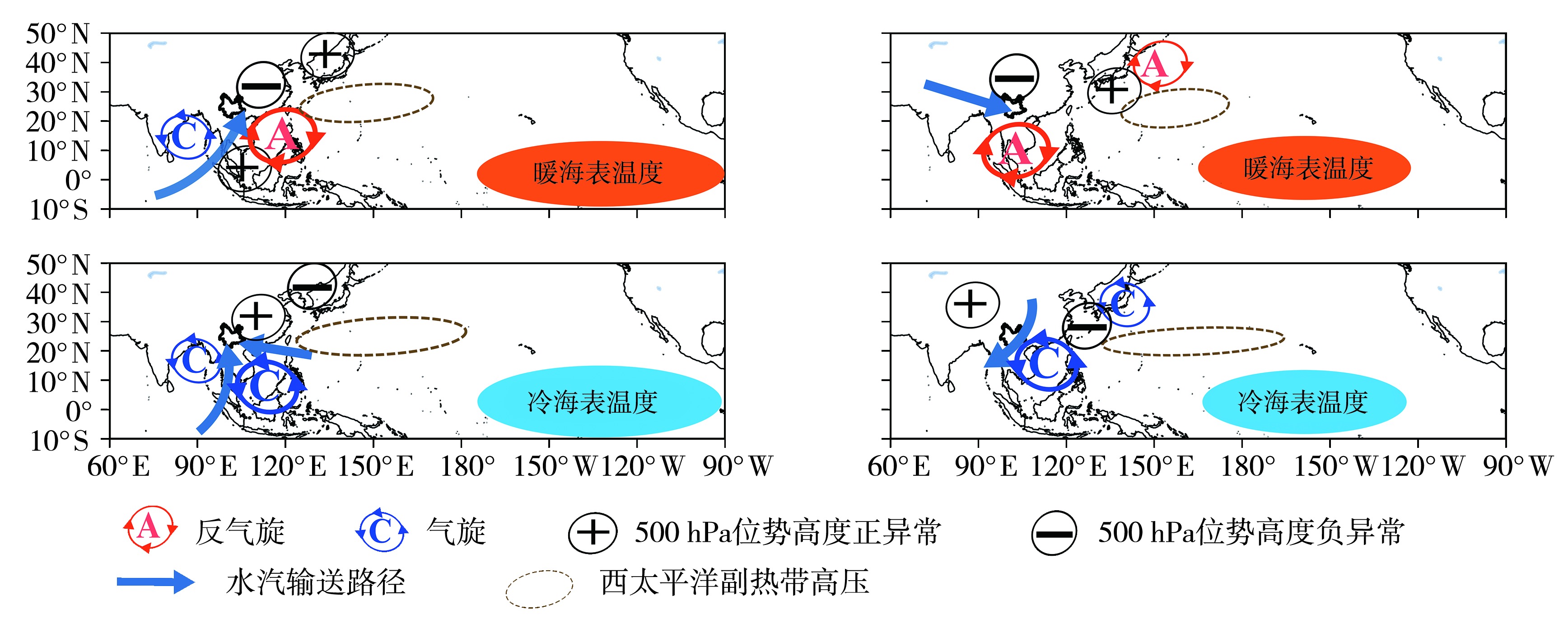 图9 EP型El Niño(a)与La Niña(c)年、CP型El Niño(b)与La Niña(d)年环流异常示意图