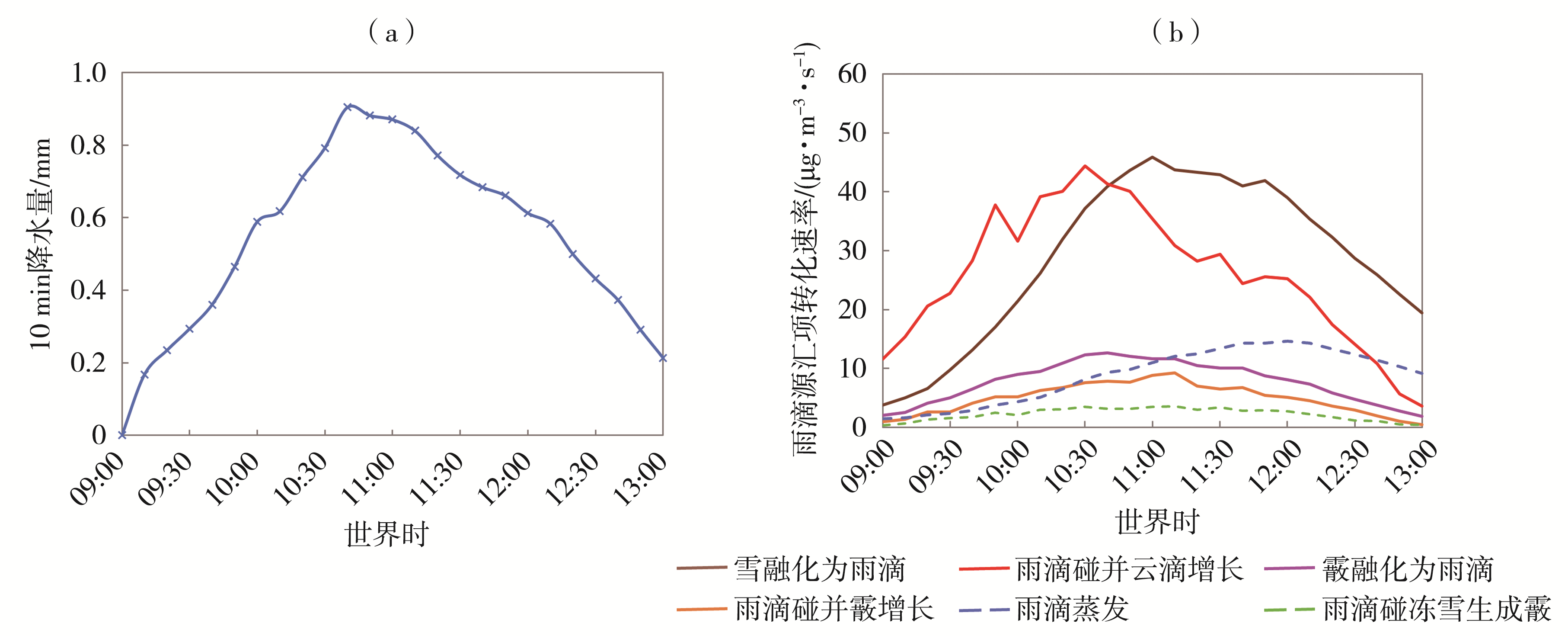 图11 2021年5月4日09:00—13:00催化影响区域内10 min自然降水量(a)和雨滴源汇项微物理过程转化速率(b)变化