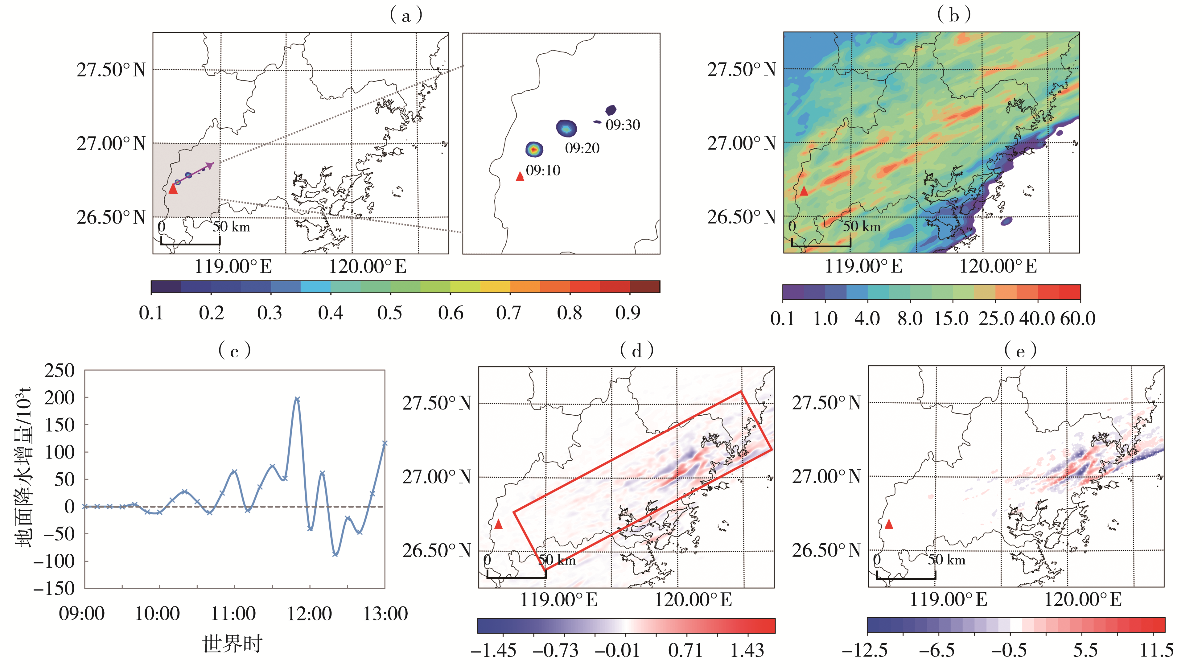Fig.6 The mass concentration (the color shaded, Unit: 10-3 μg?kg-1) and movement path (the arrow direction) of AgI after its dissemination from 09:10 to 09:30 on May 4, 2021 (a), and the natural cloud precipitation (b, Unit: mm), ground precipitation increment (c), precipitation increment (d, Unit: mm), and rain enhancement rate (e, Unit: %) after catalysis from 09:00 to 13:00 May 4, 2021 (The red triangles denote approximate locations of the artificial rain enhancement operation site, the same as below; The rectangular box indicates the seeding influence area)