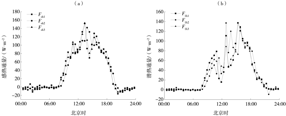 图9 3套涡动协方差系统观测计算的感热通量(a)、潜热通量(b)的平均日变化
