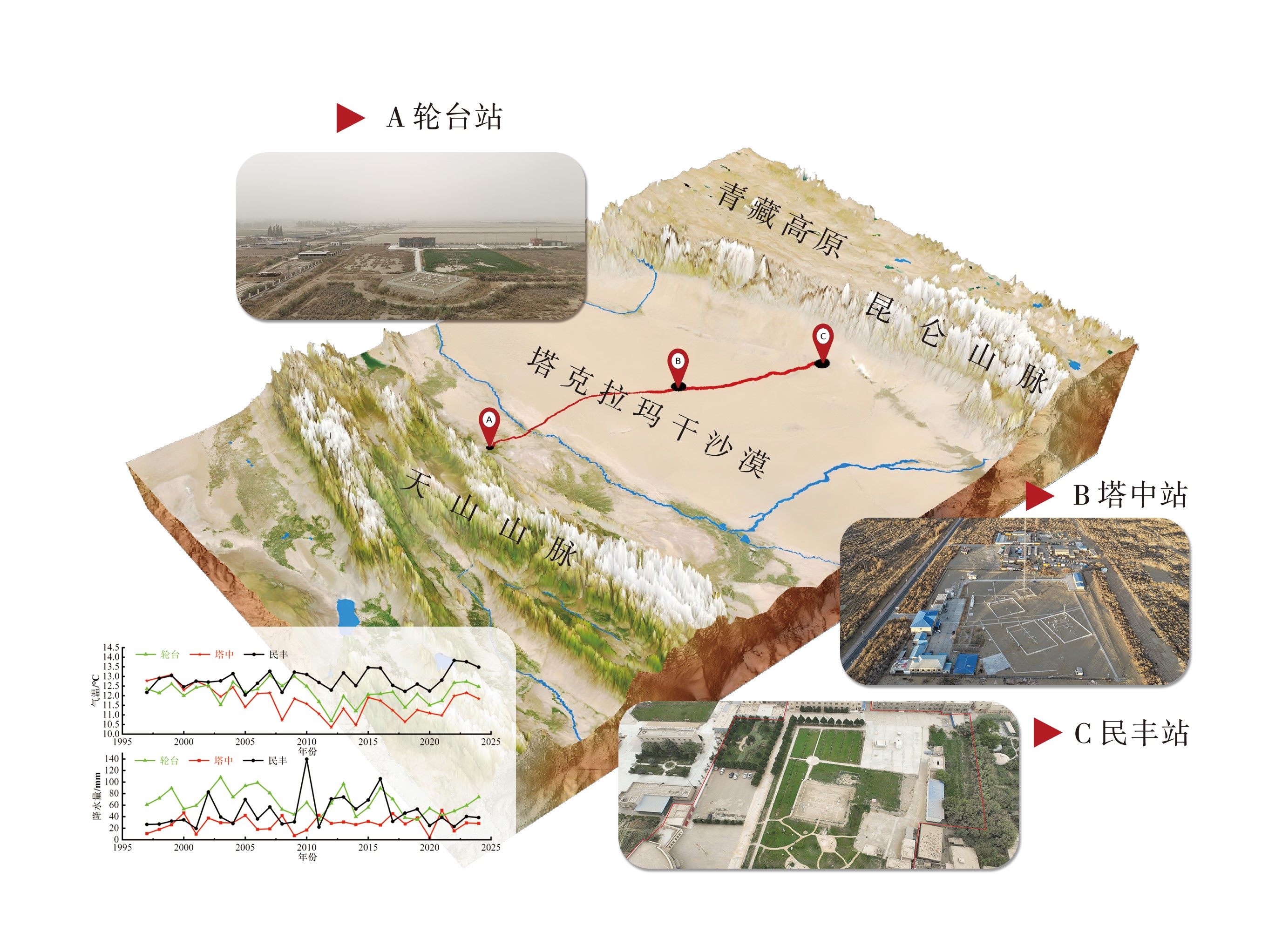 为揭示塔克拉玛干沙漠不同下垫面对气候变化的响应特征,基于塔克拉玛干沙漠北缘(轮台)、腹地(塔中)与南缘(民丰)3个站点1997—2024年的气象观测数据,采用线性趋势、M-K检验及相关性分析,对比分析近30 a该区域地面气象要素的经向变化特征。结果表明:(1)各要素年际变化区域差异显著,轮台与塔中气温先降后升,民丰持续升温,其中塔中增温最快;轮台降水显著减少,塔中微弱增加,民丰先增后减;轮台风速显著上升,塔中与民丰存在阶段性转折;日照时数仅在民丰显著下降,其余两站微升;相对湿度在轮台与塔中小幅度上升,民丰小幅度下降。(2)各要素季节变化区域特征明显,轮台秋季增温明显、风速四季显著上升、春季相对湿度上升;塔中夏季增温明显、春夏季风速波动大、夏秋季相对湿度上升;民丰春季增温明显、四季日照时数显著减少、秋冬季相对湿度下降。3站降水均集中于夏季,塔中夏季降水占比最高(约64%)。(3)各要素相关性同样呈现出区域差异,3站气温与相对湿度均呈负相关,相对湿度与降水呈正相关;气温与降水在轮台、民丰站呈正相关,在塔中则为负相关(-0.33);气温与风速在轮台为负相关,在塔中为正相关,而在民丰几乎为不相关;气温与日照时数在轮台为正相关,而在塔中、民丰站均为负相关。这些差异凸显了干旱区不同下垫面气候变化的复杂性。