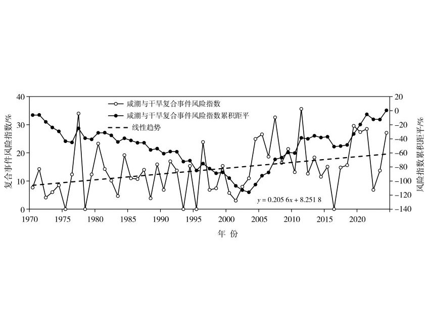 探讨咸潮与干旱复合事件风险对气候变化的响应规律,可为保障区域供水安全提供科学依据。以珠江口磨刀门水道为研究对象,基于西江流域广东段逐日干旱资料与珠江口磨刀门广昌泵站咸潮监测数据,运用咸潮与干旱复合事件风险评估模型对珠江口磨刀门咸潮与干旱复合事件风险指数进行计算、评价和预测。结果表明:珠江口磨刀门水道含氯度与西江流域广东段超前8 d平均干旱指数呈显著的非线性负相关,当干旱指数≤-0.69时,即达到咸潮入侵的阈值条件;11月至翌年3月珠江口磨刀门咸潮与干旱复合事件风险指数较高,其中12月中旬至次年1月底风险指数最高;未来中等排放情景(SSP2-4.5)下,秋季咸潮与干旱复合事件风险指数增加趋势明显,尤其11月增加最显著,春季次之;1970—2099年珠江口磨刀门咸潮与干旱复合事件风险指数总体呈现波动增加趋势,相比于近20 a(2001—2020年),近期(2021—2040年)、中期(2041—2060年)、21世纪末(2080—2099年)咸潮与干旱复合事件风险指数将分别增加1.9%、8.4%、9.6%,未来不同时段咸潮与干旱复合事件开始日期将提前10 d以上,结束日期将推迟9 d以上。未来气候变化情景下,珠江口咸潮与干旱复合事件持续时间延长,跨季节风险呈增加趋势,秋冬春持续发生咸潮与干旱复合事件风险的概率明显增大。
