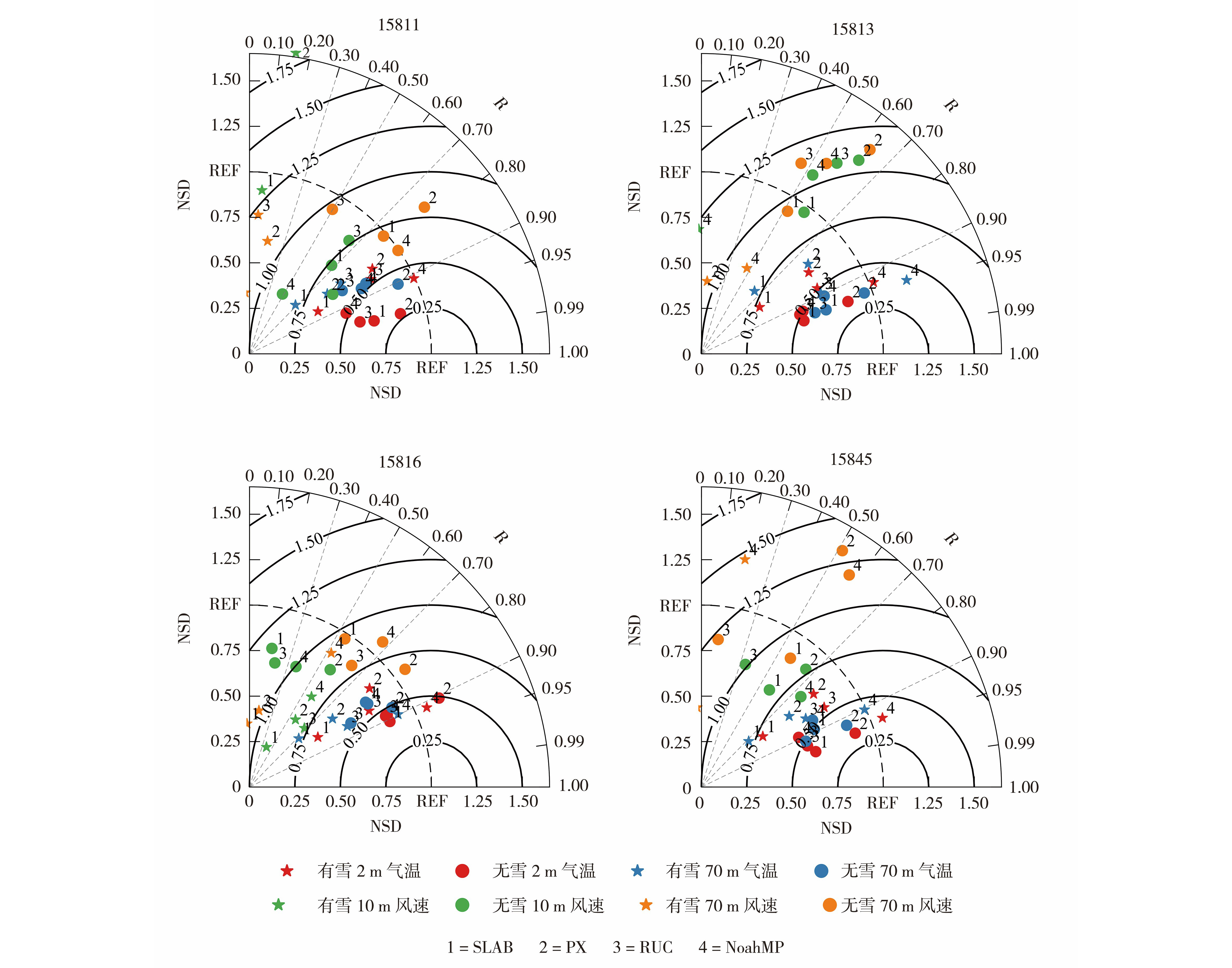 积雪对地表能量过程的复杂影响是冬季复杂地形区数值模拟的关键不确定源,亟待深入研究。利用WRF v4.3模式,针对兰州新区2014年有雪期(2月18—26日)与无雪期(1月11—19日)开展模拟对比试验,基于4座测风塔观测数据,系统评估了SLAB、Pleim-Xiu、RUC和NoahMP 4种陆面方案对近地面气象要素的模拟性能,揭示了积雪对模拟精度的影响及其对陆面方案的敏感性。结果表明,无雪期模拟效果良好:气温模拟相关系数(R)为0.80~0.97,归一化中心均方根误差(Normalized Centered Root Mean Square Errors,NCRMSE)为0.27~0.60;风速模拟R为0.46~0.82,绝对偏差普遍低于0.5 m·s-1,且能较好地再现坡风环流特征。而在积雪期,模拟精度显著下降:约半数方案气温R低于0.80,最大冷偏差超过5.00 ℃,NCRMSE升至0.38~0.79;风速NCRMSE增至0.77~2.52,风向频率误差可达无雪期的2倍。泰勒图分析进一步表明,积雪增强了模拟结果对陆面方案的敏感性,有雪期各方案归一化标准差的离散性显著大于无雪期。在4种方案中,NoahMP在积雪期表现最优,其气温R稳定在0.9左右,冷偏差最小,且NCRMSE多低于0.5。准确表征积雪过程对提升冬季复杂地形区的气象模拟能力具有重要意义。