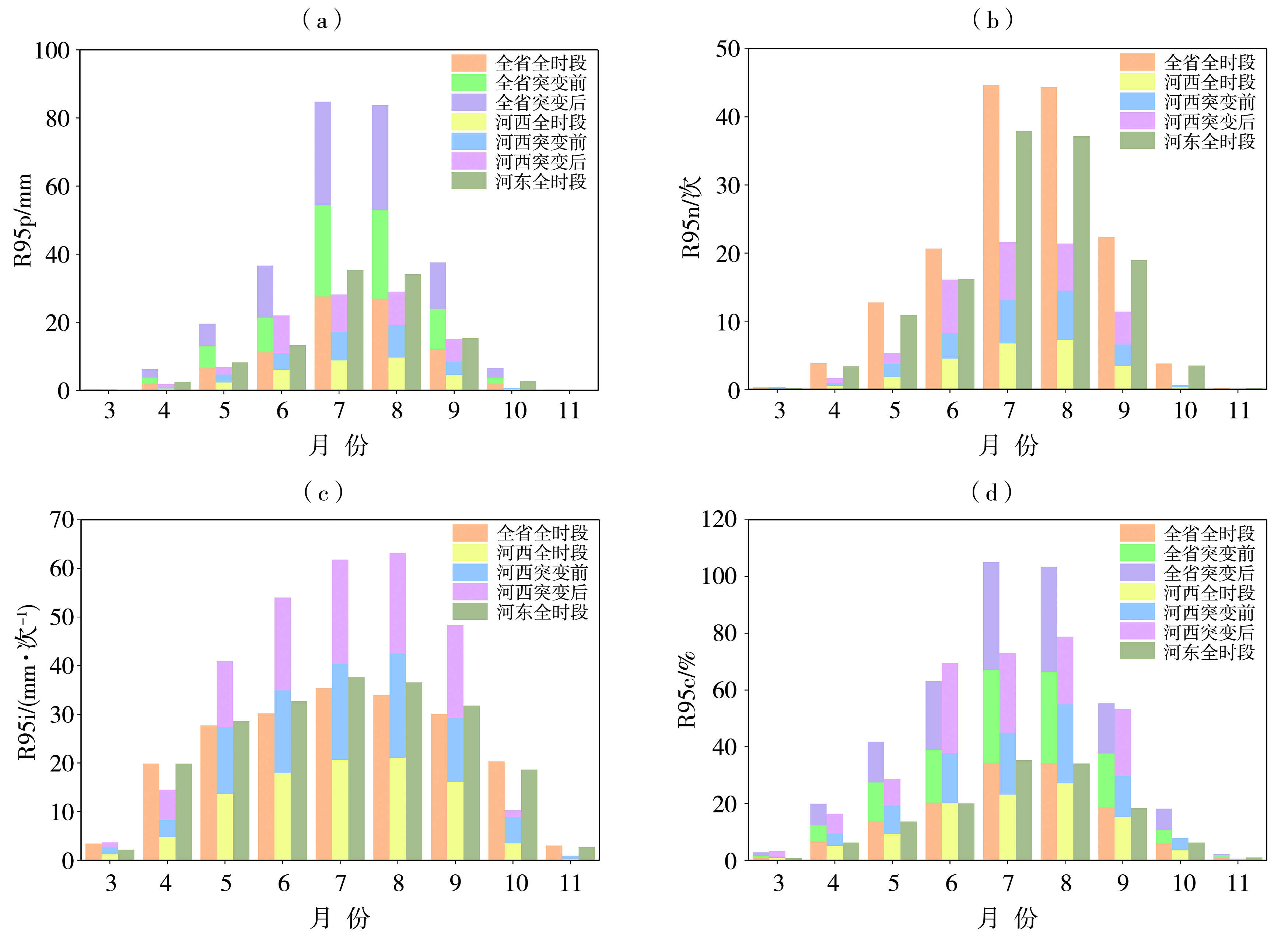 全面认识极端降水时空特征、探究其关键影响因子,有助于更好地防御极端降水带来的不利影响。利用1961—2022年甘肃58个国家基本气象站均一化逐日降水数据,选取12个极端降水指数,分析甘肃极端降水时空特征;并运用地理探测器,量化大尺度气候因子对极端降水的贡献率。结果表明:1)近62 a甘肃持续干燥和湿润日数呈减少趋势,其余表征极端降水强度、频次的指数以不显著上升为主,强降水事件频次上升速率最大,达2.38 次·(10 a)-1;河西地区极端降水呈显著增多增强趋势,并主要在2010年前后突变增多;甘肃强降水事件出现在3—11月,以7月和8月最多最强,强降水呈增多增强趋势的月份居多,且以6月上升速率最大。2)极端降水指数呈上升趋势的站点主要出现在河西地区大部、兰州大部、白银中北部、临夏、陇东地区东南部和陇南南部。3)热带印度洋全区一致海温模态和东部型ENSO指数分别对河西(29%)和河东(33%)地区极端降水贡献率最大;热带印度洋海温增暖有利于河西地区极端降水增多增强,而东部型厄尔尼诺事件不利于河东地区极端降水发生发展;此外,双因子交互作用对极端降水的贡献率明显大于单因子作用。