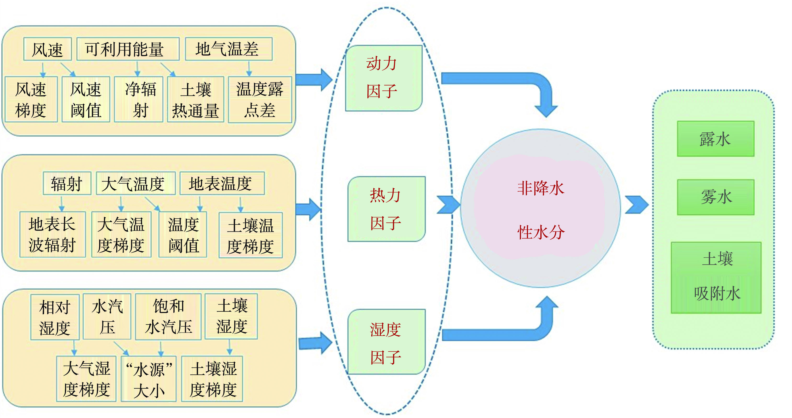 The warming trend of the global climate system continues, and the impact on natural ecosystems and water resources continues to rise, aggravating the already fragile global water resources. At this background, as a potential water resource, non-precipitation water (NPW) in arid area plays an important role in the maintenance of ecosystem and land surface water balance in arid area. Therefore, based on the present results of international research on NPW, the development process of NPW is summarized. The observation methods, variation characteristics, formation mechanism and the contribution of NPW to land surface water balance and its effects on crops in arid areas of Northwest China were reviewed. Finally, on the basis of combining the international frontiers, hot issues and development trends of NPW research, the shortcomings and problems of current NPW research are analyzed scientifically. It is pointed out that the study of NPW should focus on further revealing the complex formation mechanism of NPW on land surface, and strengthen the cognition of NPW in different climatic regions and different underlying surfaces. Breakthroughs have been made in key scientific issues such as the establishment of a specially targeted land surface NPW observation system, the development of the parameterization of land surface NPW in the numerical model, and the research and development of technical standards for the development and utilization of land surface NPW.
