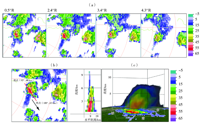 The reflectivity factor of different elevation angles (a), reflectivity factor vertical profile (b) and three-dimensional reflectivity factor (c) at 19:44 BST June 20, 2012 (Unit: dBZ)