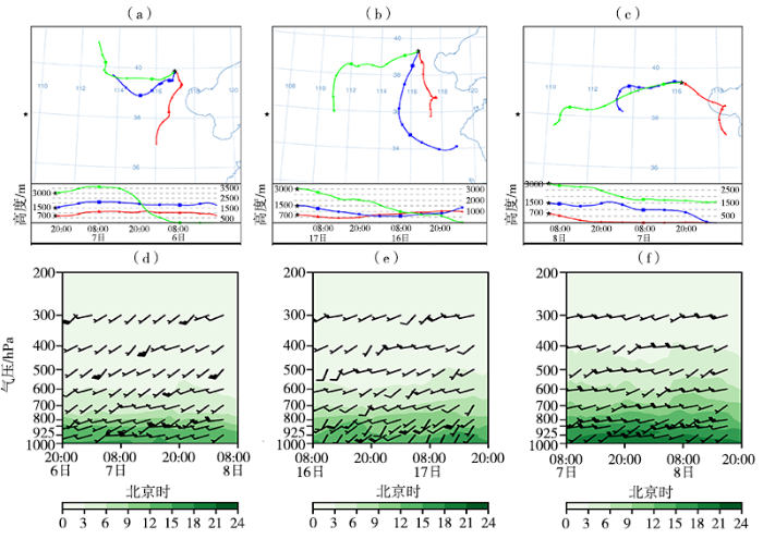 3类线状MCSs强降水过程相应站点水汽后向轨迹(a、b、c),以及比湿(彩色填色区,单位:g·kg-1)、风(风矢,单位:m·s-1)的时间-高度剖面(d、e、f)