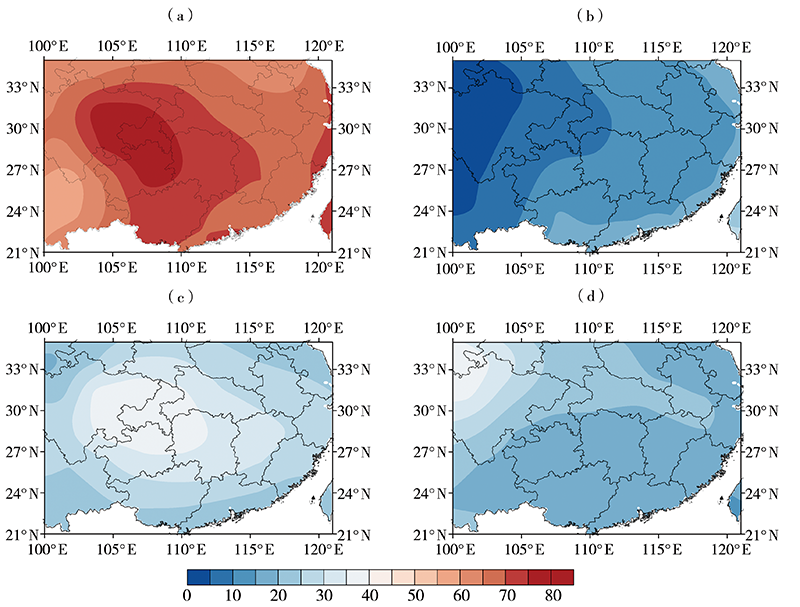 | 图2 1998—2009年中国南方地区年平均云量空间分布(单位:%) (a)总云量,(b)低云量,(c)中云量,(d)高云量 |
