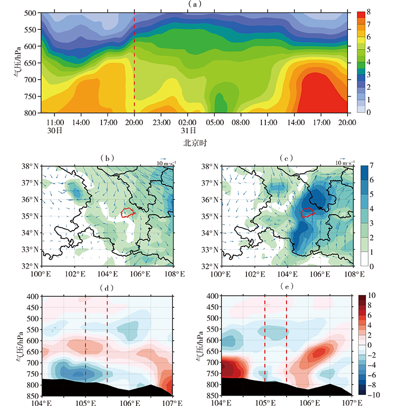| Fig.5 The time-height profile of specific humidity over Tongwei station from 08:00 BST May 30 to 20:00 BST May 31, 2020 (a), water vapor flux (the color shaded,Unit: 10-3 g·hPa-1·cm-1·s-1) and wind field (vectors, Unit:m·s-1)at 700 hPa (b,c) and the zonal profiles of water vapor flux divergence along 35.25°N (d, e, Unit:10-8 g·hPa-1·cm-2·s-1) at 19:00 BST May 30 (b, d) and 31 (c, e), 2020 |