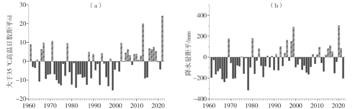 1961—2022年长江中下游夏季高温日数(a)、降水量(b)距平逐年变化