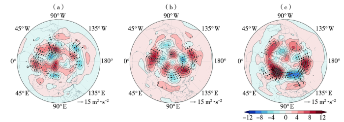 2022年6(a)、7(b)、8(c)月500 hPa高度距平(填色区,单位:dagpm)及T-N波作用通量(箭矢,单位:m2·s-2)空间分布
