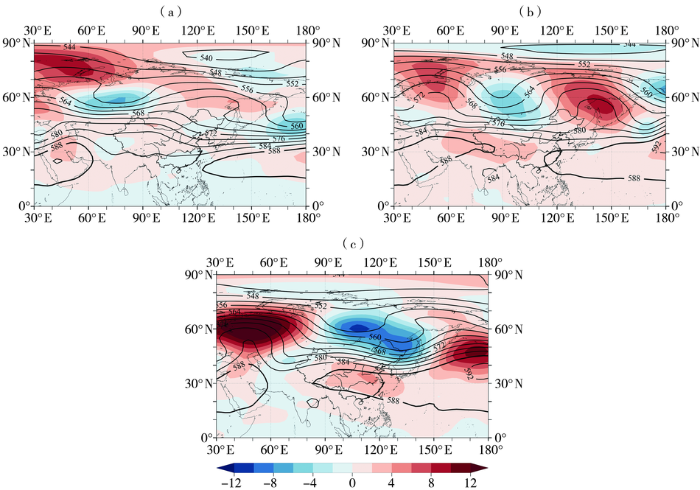 2022年6(a)、7(b)、8(c)月500 hPa高度场(等值线)及其距平(填色区)空间分布(单位:dagpm)