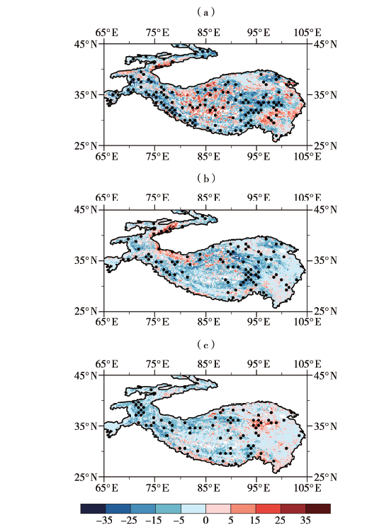 | 图13 2022年5(a)、6(b)、7(c)月青藏高原积雪异常分布(单位:%) (打点区域表示超过1倍标准差) |