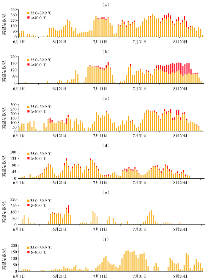 The daily evolution of number of stations with high temperature in six geographical regions of China in summer 2022