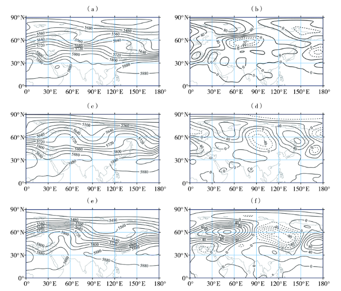 The distribution of 500 hPa geopotential height field (a, c, e) and its anomaly (b, d, f) in the northeast Hemisphere in each month of summer 2022 (Unit: gpm)