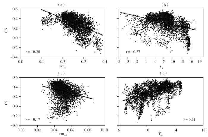 式中:CS为蒸散-降水耦合度;b 0 、b 1 、b 2 ,b 0 ' 、b 1 ' 、b 2 ' 分别为两个多元回归方程的待估参数;sma 为平均土壤湿度,T a 为平均气温; smstd 为土壤湿度变率, T std 为气温变率。