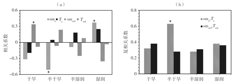 | 图13 不同干湿气候背景区蒸散-降水耦合度分别与平均土壤湿度、平均气温、土壤湿度变率和气温变率的Pearson相关系数(a),蒸散-降水耦合度与平均土壤湿度和平均气温、土壤湿度变率和气温变率的复相关系数(b) |