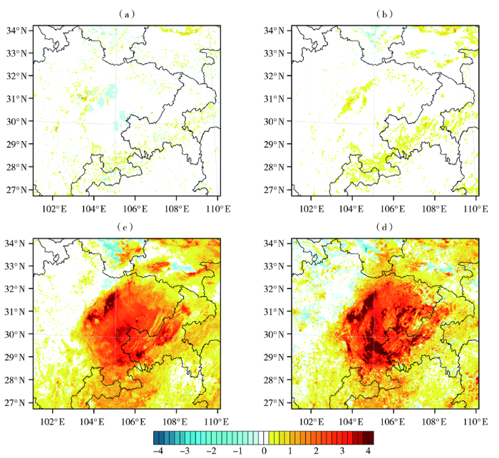 The spatial distribution of differences of simutlated temperature (a,b) (Unit:℃) , water vapor mixing ratio (c,d) (Unit:g·kg-1) at 700 hPa (a,c) and 500 hPa (b,d)between two groups of experiments at 16:00 BST on 17 August 2019