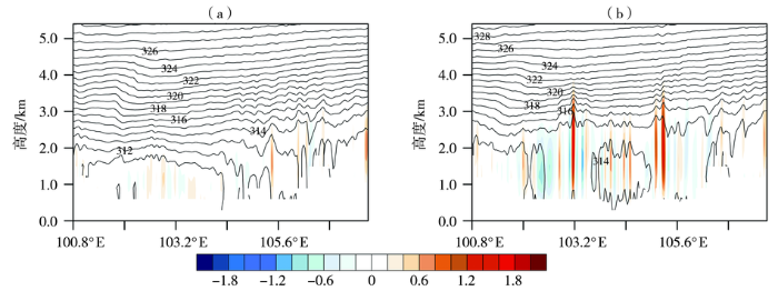 Lontitude-height cross sections of potential temperature (isoline,Unit: K) and vertical velocity (color shaded areas,Unit:m·s-1) simulated by two groups of experiments along 30°N at 16:00 BST on 17 August 2019