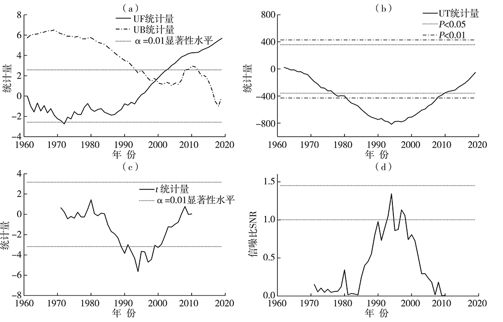 | 图3 1961—2019年秦淮河流域年平均气温M-K(a)、Pettitt(b)、滑动t(c)及Yamamoto(d)突变检验 |