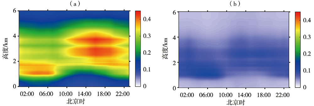| 图5 祁连山东段夏半年(a)和冬半年(b)LWC垂直分布日变化(单位:g·m-3) |