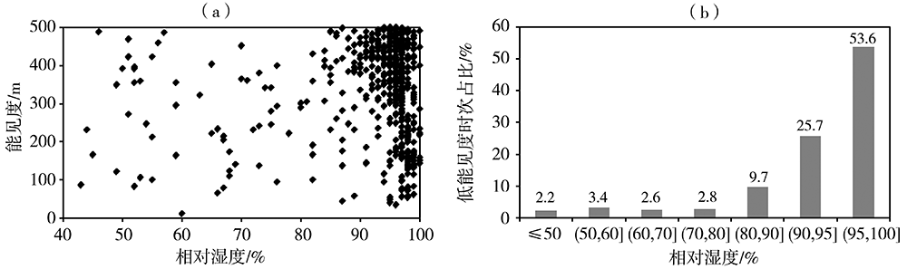 | Fig.7 The scatter plot between low visibility and relative humidity (a) and the proportion of occurring times of low visibility under different relative humidity intervals (b)along Shaanxi section of the Lian-Huo expressway |