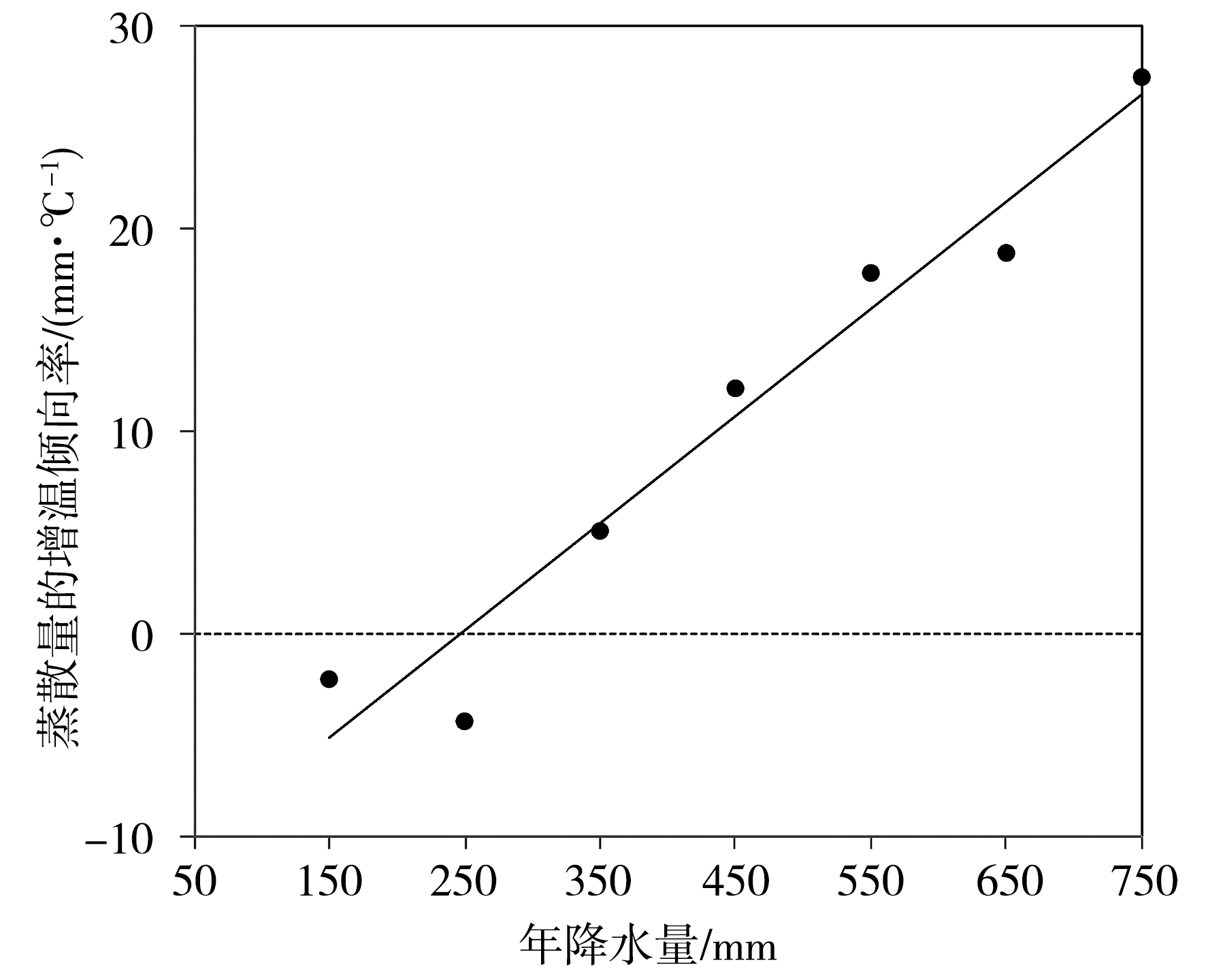 图7 年平均地表蒸散量的增温倾向率随年降水量的变化(Zhang et al., |
