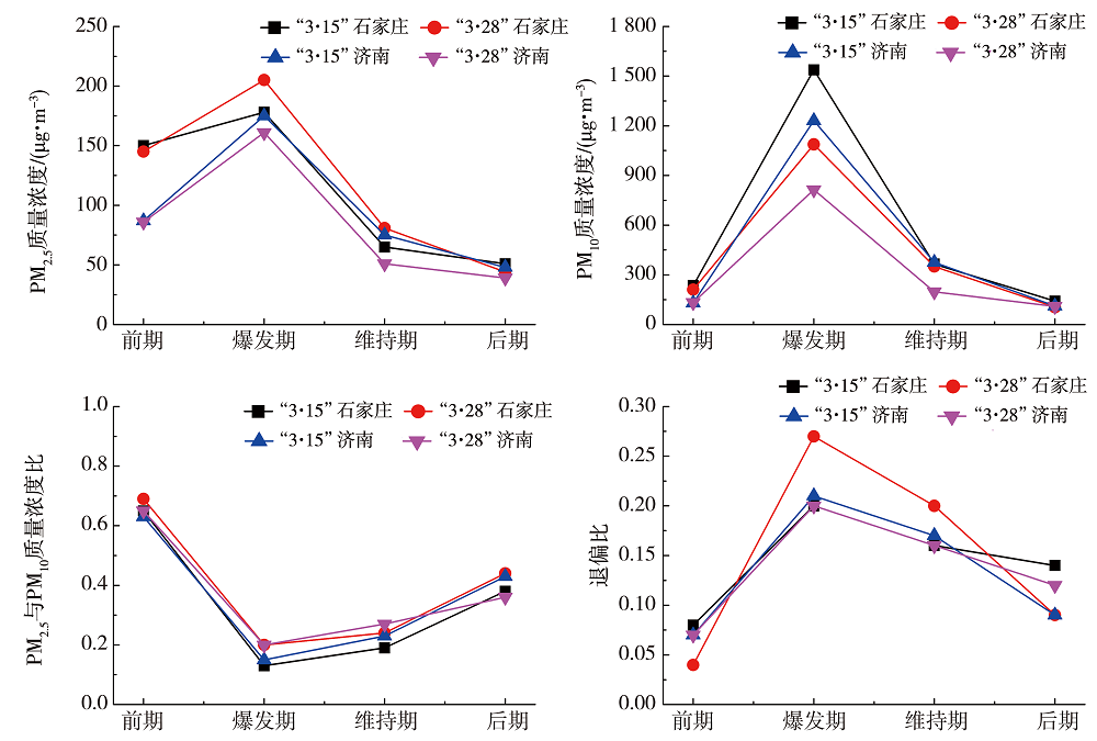 | Fig.12 Variation of mass concentration of PM2.5 (a) and PM10 (b) as well as their ratio (c), and depolarization ratio (d) at different stages of two strong dust processes in Shijiazhuang and Jinan |