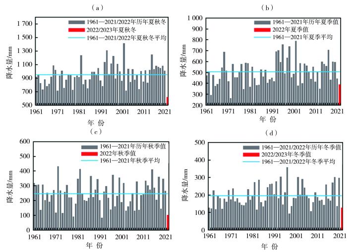 1961—2022/2023年夏秋冬季(a)与夏(b)、秋(c)、冬(d)季湖南平均降水量序列