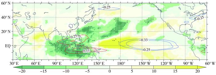(The red contours are climate state, the dotted area indicates that the anomaly exceeded the extreme value since 1981. the same as below)