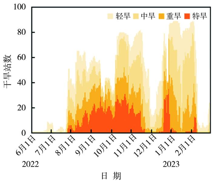 与帕默尔干旱指数(Palmer Drought Severity Index,PDSI)等其他表征干旱的指数相比,SPI很好地捕捉了干旱的多尺度特征(Wells et al.,2004)。图3为2022年6月1日至2023年2月28日基于SPI划分的湖南不同等级干旱站数逐日变化。可以看出,2022年6月1日至7月23日,湖南基本没有中旱以上站点;7月24日开始,湖南中旱以上干旱站点迅速增多,10月20日中旱以上站点数达到高峰,共77站,占总站数(97站)的79.4%,其中中旱25站、重旱23站、特旱29站,重到特旱站点数占比53.6%,一直到11月16日每天中旱以上站点数都在50站以上,之后中旱以上站点开始减少,到11月30日下降到4站,夏秋干旱有所缓解。12月6日开始中旱以上站点数又迅速增多,冬季干旱开始发展,27日干旱站数达到峰值(78站),占总站数的80.4%,其中中旱3站、重旱40站、特旱35站,重到特旱站数占比高达77.3%;27日之后干旱站数有所下降,到2023年1月15日中旱以上站点数下降到20站,之后又逐步增加,直至2月7日,中旱以上站点数迅速减少,到2月9日,重、特旱基本消失,干旱缓解。