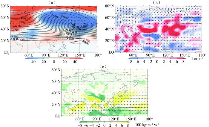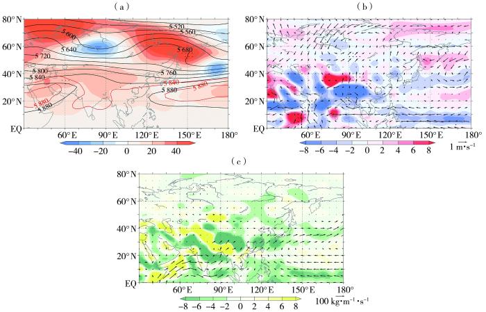 2022年6—7月500 hPa高度场(黑色等值线)及距平(填色,单位:gpm)(a),850 hPa风场距平(箭矢,单位:m·s-1)及垂直速度(填色,单位:10-2 Pa·s-1)(b),整层积分水汽通量(矢量,单位:kg·m-1·s-1)和水汽通量散度距平(填色,单位:10-7 kg·m-2·s-1)(c)