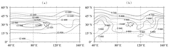 The average geopotential height from July to August during 1980-2010 (dashed lines) and from 25 July to 9 August 2021 (solid lines) at 200 hPa (a) and 500 hPa (b) (Unit: gpm)
