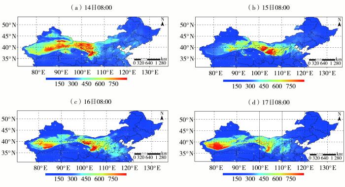 在蒙古气旋强烈发展及其后部冷高压共同作用下,2021年3月中旬我国北方出现大范围强沙尘暴天气(张璐等,2022)。图1是2021年3月14—17日08:00(北京时,下同)能见度与500 hPa高度场,图2是利用PM10质量浓度数据分析得到的中国北方地区沙尘浓度分布。可以看出,14日开始,新疆中南部至甘肃、内蒙古西部一带沙尘浓度较高(1 110~1 668 μg·m-3),西北地区能见度有所下降;15日08:00至16日08:00,河套地区小槽东移,北方大部受西北气流控制,沙尘浓度增大,西北地区能见度进一步降低,新疆南部、甘肃酒泉等地能见度不足10 km,同时,沙尘影响范围东扩至陕西北部、内蒙中部、京津冀地区;17日08:00,西北地区沙尘范围略微收缩南压,北部沙尘边界收缩至宁夏、陕西境内,西北地区能见度有所上升,新疆南部沙尘浓度较高,其余地方有所降低;18日08:00,沙尘天气减弱,能见度继续上升,只有新疆南部和巴丹吉林沙漠地区沙尘浓度较高(1 000 μg·m-3左右)。此外,图上南方地区能见度较低是因为该地区出现了大面积大雾天气。