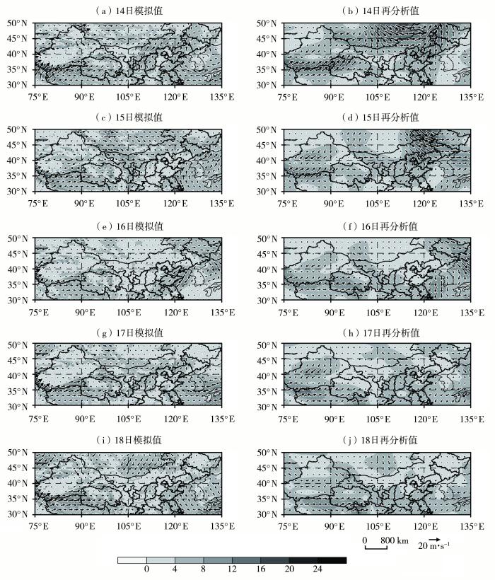 Tegen和Fung(1994)研究表明在很多数值模式中,10 m风速超过6.5 m·s-1是沙尘天气的发生条件。另外,NCEP/NCAR再分析资料在很多研究中被广泛应用,可以较好地反映大气实况特征(赵佳莹和徐海明,2014)。所以本文通过对比分析再分析资料和模式预报的10 m风速检验模式预报能力。图3是模式模拟的与NCEP再分析资料分析的10 m风速,可以看出模式对北方地区延伸期10 m风速具有一定的预报能力。其中,西藏到青海一带的偏西风预报效果较好,内蒙北部的风速预报效果较差。模拟的风速绝对值与再分析资料相比整体偏小,模拟的区域内平均风速为4.7 m·s-1,再分析资料风速为7.3 m·s-1,模拟风速偏小2.6 m·s-1。其中,3月14日,新疆地区、内蒙西部模拟风速小于4.0 m·s-1,而再分析资料为4.0~8.0 m·s-1,东北地区再分析资料风速为8.0~16.0 m·s-1,模拟风速为4.0~12.0 m·s-1;15日,新疆、甘肃、内蒙西部模拟风速偏小;16—17日,新疆地区模拟风速偏小;18日,新疆、甘肃地区模拟风速偏小。