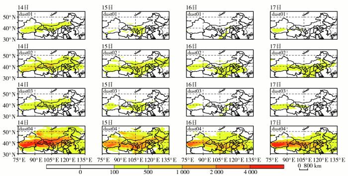 图6是2021年3月14—17日模拟的逐日08:00不同粒径沙尘柱含量空间分布。14日,新疆南部、甘肃河西、内蒙古大部、京津冀地区沙尘柱含量出现大值区,其中,0.01~1.00 µm粒径粒子沙尘柱含量在新疆南部、甘肃河西、内蒙古中西部为100~500 mg·m-2;1.00~2.50 µm粒径粒子的沙尘柱含量在新疆南部、甘肃、内蒙古超过100 mg·m-2,尤其新疆南部达700~900 mg·m-2;2.50~5.00 µm粒径粒子沙尘柱含量新疆南部、甘肃、内蒙古为大值区(100~500 mg·m-2);5.00~20.00 µm粒径粒子30°N以北大部分地区沙尘柱含量大于100 mg·m-2,新疆南部、甘肃、内蒙古西部大于900 mg·m-2。15日,随着沙尘天气发展,不同粒径粒子沙尘柱含量大值区分布范围均有所东扩;16日,大值区分布范围南移,沙尘柱含量有所减小;17日,粒径在5.00 µm以下粒子的沙尘柱含量在100 mg·m-2以上的区域有所缩小;18日(图略),100 mg·m-2以上区域范围较前几日缩小,但沙尘柱含量较前一日大。总的沙尘柱含量空间分布范围和5.00~20.00 µm粒径粒子几乎一致(图略),说明沙尘暴天气过程中,大气中5.00~20.00 µm粒径粒子所占比例较大。
