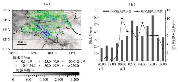 2022年6月3日20:00至4日08:00陕南汉江盆地累计降水量空间分布(a)及小时最大降水量和短时强降水站数(b)