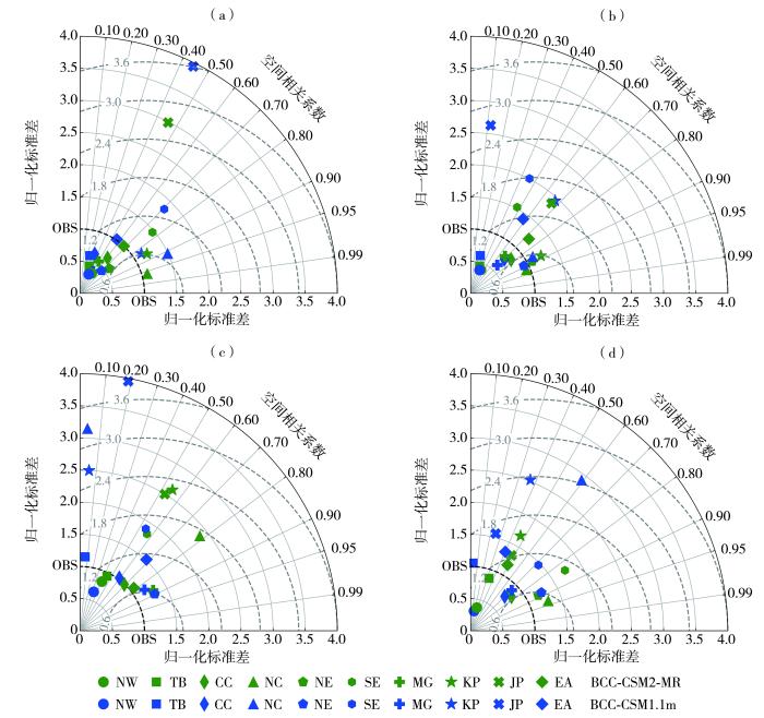 Spatial Taylor diagrams of mean precipitation simulated by BCC-CSM2-MR and BCC-CSM1.1m models in East Asia (EA) and different sub-regions in winter (a), spring (b), summer (c) and autumn (d) during 1981-2010