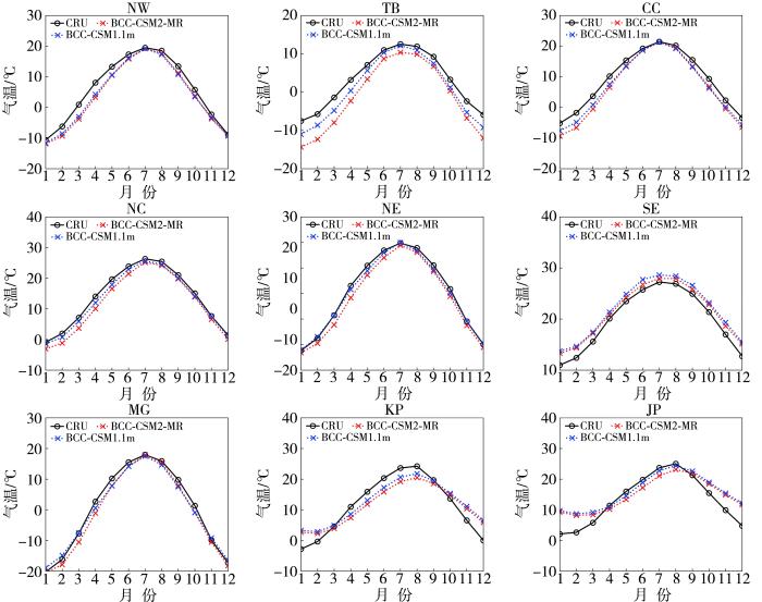 两个模式对各子区域气温月际变化模拟效果均较好,但仍存在区域差异(图7)。BCC-CSM2-MR与BCC-CSM1.1m对中国东北、东南及蒙古地区气温月际变化模拟较好,但两个模式均低估中国西北、华中及华北地区1—4月气温,且对青藏高原各月气温整体低估,同时对朝鲜半岛和日本地区5—7月气温低估、冬季气温高估。相比BCC-CSM1.1m,BCC-CSM2-MR模式对气温月际变化模拟能力没有明显改进,且对东亚大部分区域气温月际变化的模拟误差大于BCC-CSM1.1m。