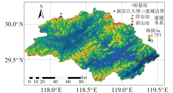 钱塘江是浙江省最大的河流,流域面积55 491 km2,几乎占全省总面积的一半。这一流域不仅是浙江省经济最发达的地区,也是长江经济开发区沪杭甬金三角地带的重要组成部分。新安江是钱塘江正源(图1),干流全长373 km,流域面积11 720 km2。新安江流域属亚热带季风气候,夏热冬温,四季分明,季风明显,雨热同期。该流域多年平均降雨量为1 710.0 mm,年降水量最大值出现在2020年,为2 496.5 mm;最小值出现在1978年,为1 040.0 mm。流域内降水、径流年内分配极不均匀,汛期(4—10月)降水量占全年的69%,冬季(12月至次年2月)降水量仅占全年的13.6%左右(潘娅英等,2018)。