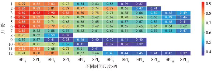 结合新安江流域汛期(4—10月)与非汛期(11月至次年3月)气候特性,系统分析不同时间尺度的SPI和SRI1之间的相关性及滞后性特征。新安江流域的气候变化呈明显季节性差异:冬季(12至次年2月)为大陆性高压控制,天气晴冷;春季(3—5月)随着西太平洋副热带高压(简称“副高”)北进,锋面气旋活动增多,春雨连绵不断,降水量增多;夏季(6—8月)主要受太平洋副热带高压控制,天气晴热;秋季(9—10月)为夏季风向冬季风过渡期,气温变化大(樊高峰等,2008;林盛吉,2011;曹欣荣,2014)。由图7可知,冬末到夏初(2—7月)不同时间尺度的SPI与SRI的相关系数均大于等于0.41,且通过95%的置信水平,其中3月SPI1、SPI2和SRI的相关系数在12个时间尺度中最高,6月SPI1与SRI的相关系数最高,为0.92;8—9月SRI与不同时间尺度SPI的相关性较低,8月仅有SPI1、SPI2、SPI3、SPI4通过显著性检验,而9月不同时间尺度的SPI与SRI的最大相关系数相较于其他月份最小,为0.59。新安江流域降水从1月起逐渐增多,6月达到最大值后在7月迅速减少(潘娅英等,2018),这种降水量特征使得新安江流域2—7月整体处于河流和降水补给充足的状态,当降水强度较强历时较长时,大气降水迅速渗入土壤,土壤下渗量达到饱和,形成较大量的地表径流,流域由缺水转为水分充沛,水文干旱得以缓解;相反,当降水减少时,流域的径流量也相应减小,导致水文干旱指数与气象干旱指数之间表现为强相关。夏末秋初(8—9月)新安江流域进入台汛期,由台风引发的过程性降水虽然增加,但这一时期以副高边缘午后阵性降水为主,降水变率大。同时,伴随高温热浪的出现,流域蒸散发增大,水文干旱指数与气象干旱指数之间相关性减弱。