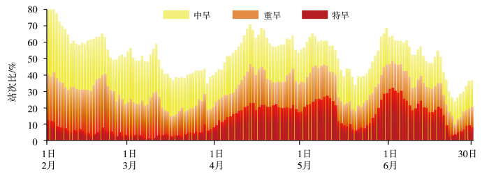 ... 根据王劲松等(2007)的研究,使用K干旱指数将干旱划分为5个等级:K>2.0时为适宜,1.5<K≤2.0时为轻旱,1.0<K≤1.5时为中旱,0.5<K≤1.0时为重旱,K≤0.5时为特旱.干旱日数定义为某站点某月达到相应干旱等级标准的总日数.干旱站次比为区域内达到某等级干旱的站点数占该区域内总站点数的比例.不同等级干旱站次比可用于衡量某一区域研究时段内干旱发生的范围和强度. ...