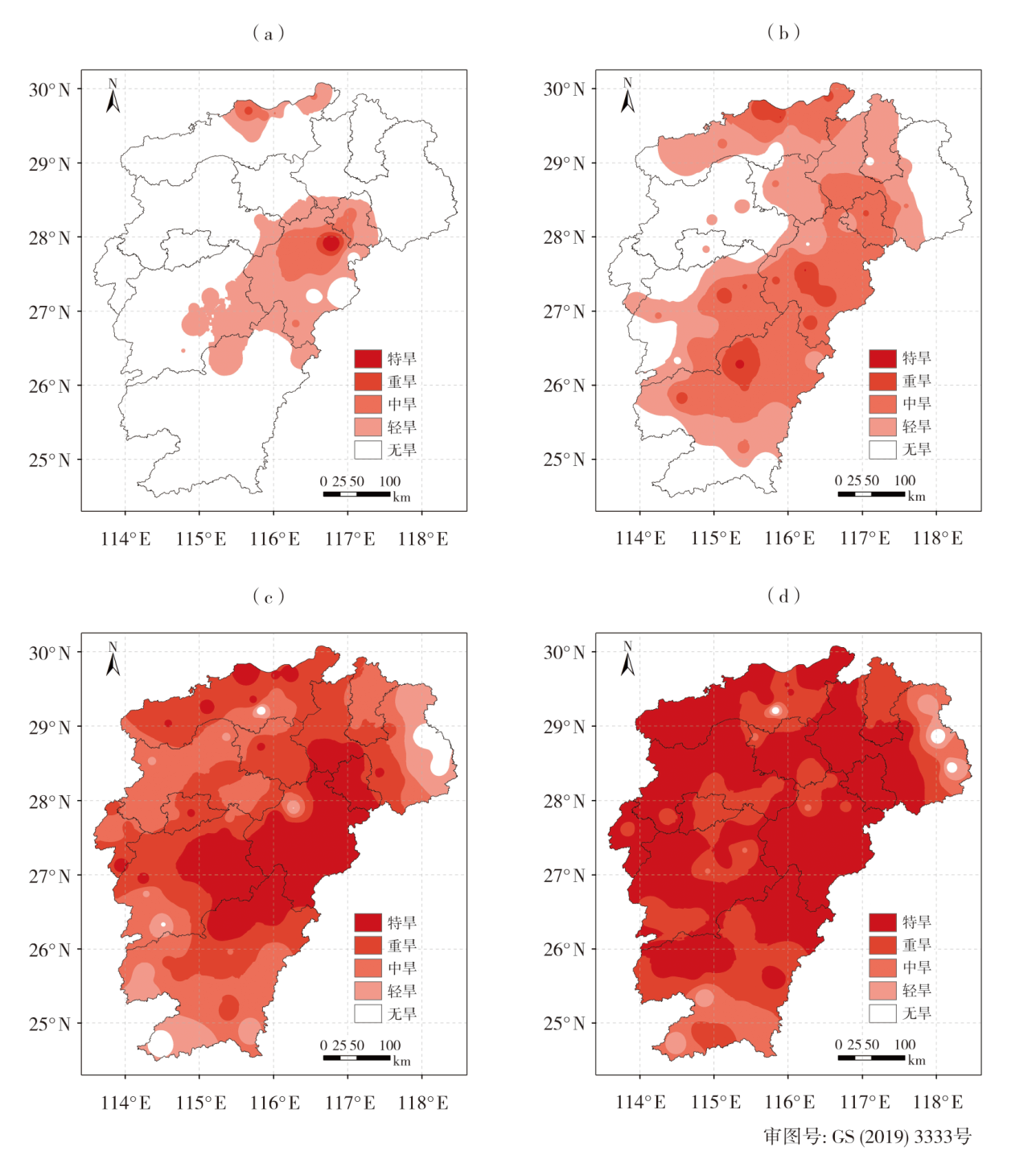 | 图5 江西省2022年7月12日(a)及30日(b)、8月17日(c)、9月2日(d)不同等级干旱空间分布 |