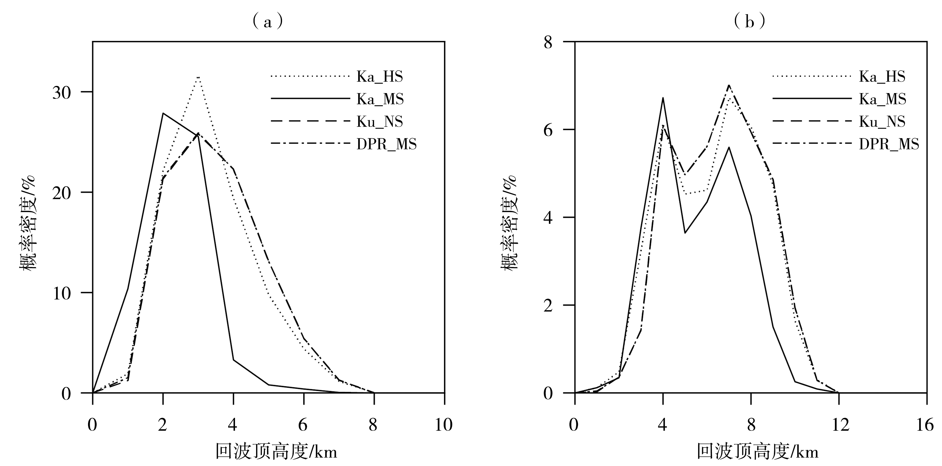 | 图6 2016年5月14日(a)及7月28日(b)两次降水个例GPM DPR的4种产品回波顶高度概率密度分布 |