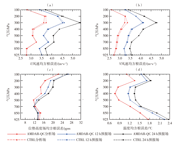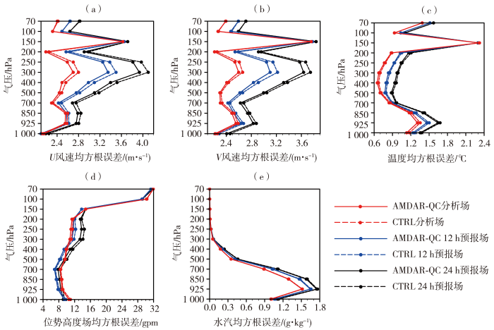 为进一步检验同化质量控制后AMDAR资料对分析场和预报场的影响,以ERA-5再分析资料作为参考也计算了RMSE。图6为2020年3月25日00:00至4月7日21:00两组循环同化试验的分析场及12、24 h预报场不同变量与ERA-5再分析资料的RMSE随高度变化。可以看出,在同化质量控制后AMDAR资料分析场的风场、温度和位势高度的RMSE均小于未同化AMDAR资料,且这种改进可以延续到12、24 h预报场。由于AMDAR资料中没有水汽变量观测,所以在同化AMDAR资料后对水汽的影响较小。